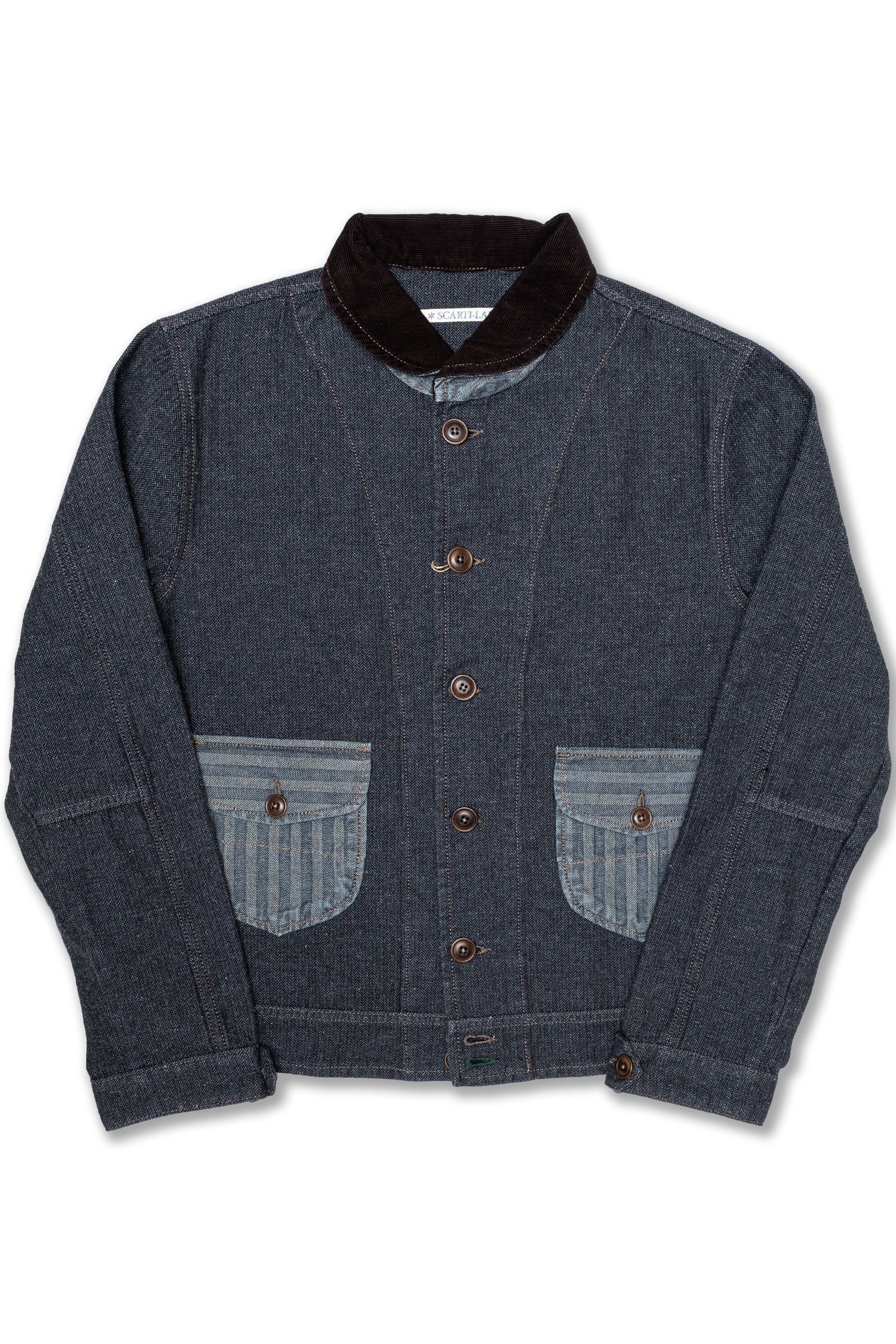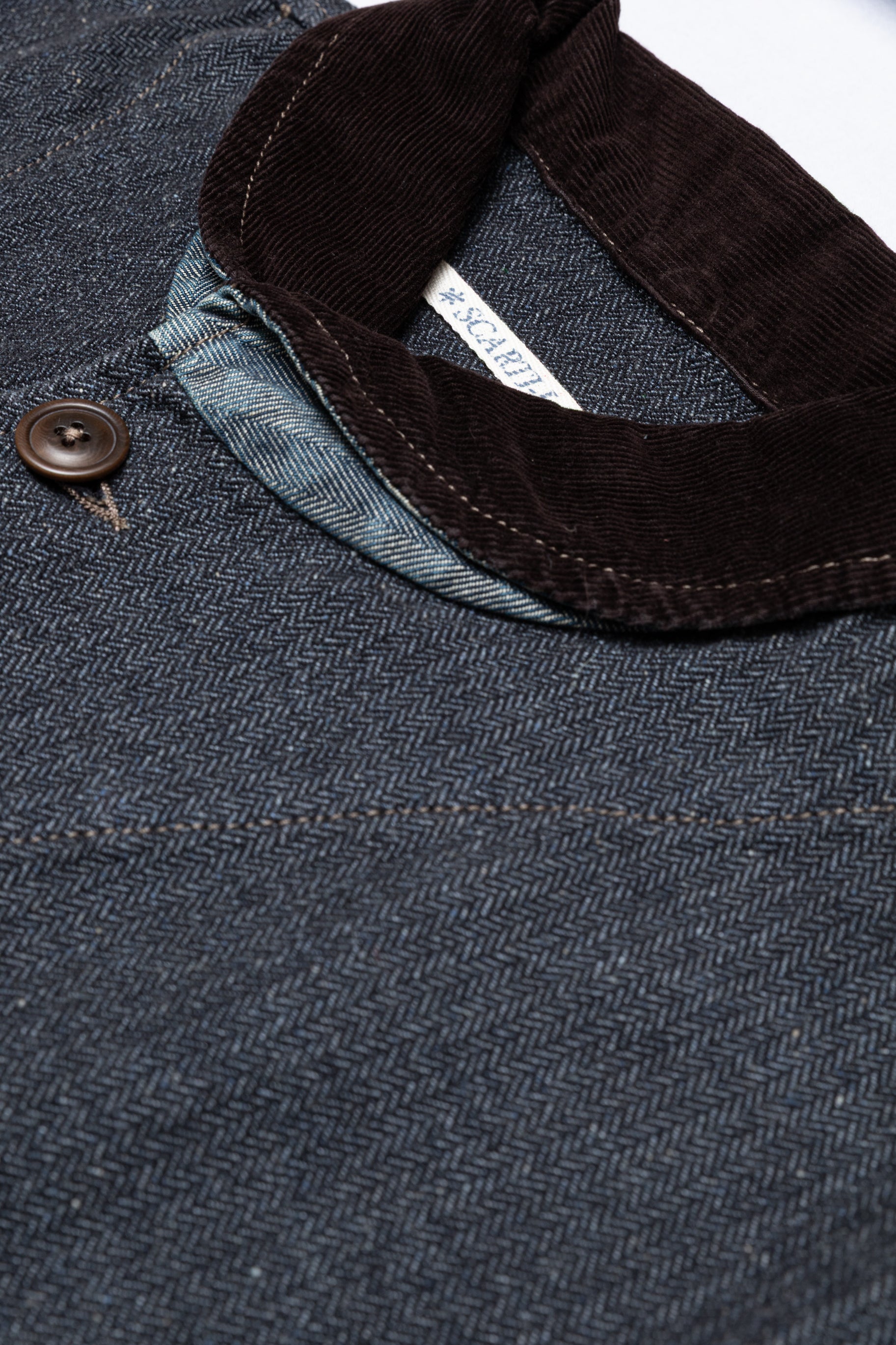Embrace the 707, Scartilab's thoughtfully crafted cossack jacket that honors tradition while introducing a graceful shawl collar. What makes this piece special is its fabric story: A navy herringbone woven at a cherished French mill, now preserved through carefully maintained deadstock. This exceptionally rare textile supports your desire for something truly meaningful, transforming the jacket into both a reliable wardrobe companion and a treasured collector's piece. Complementary contrasting pockets, crafted from the same precious deadstock in a different tone, add warmth and character to every moment you wear it.