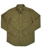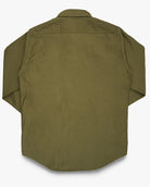 8oz Japanese whipcord CPO shirt in olive military tone. Built from durable, tightly woven fabric with windproofing properties and a smooth, silky finish. Features a yokeless front, straight rear yoke, oversized copper snaps, and hand-warmer pockets. Extended body length and utilitarian design for everyday wear.