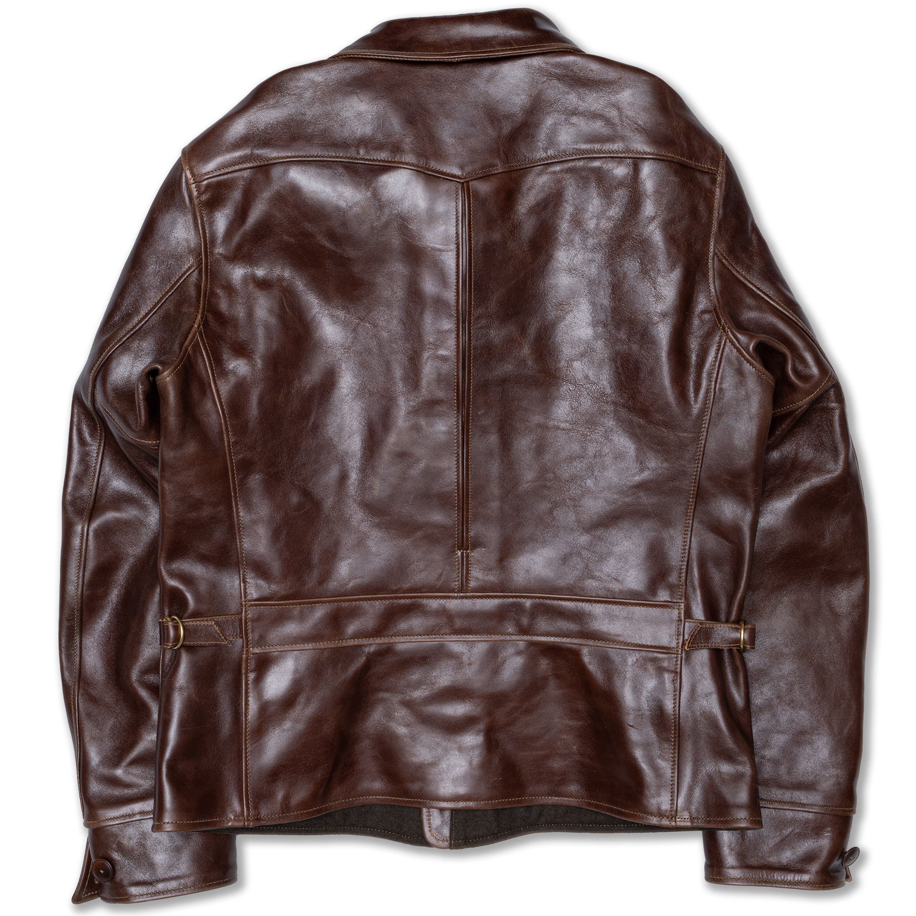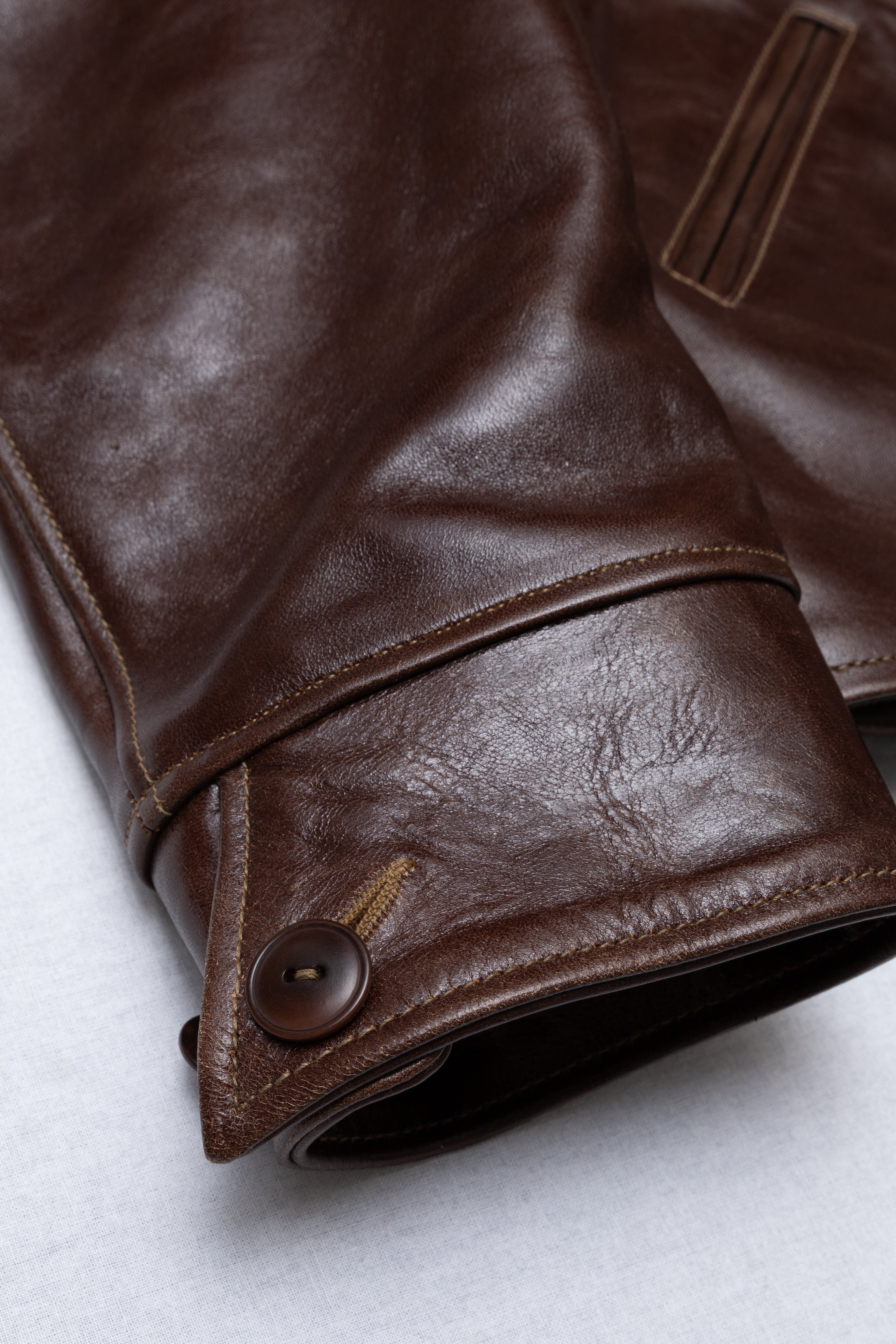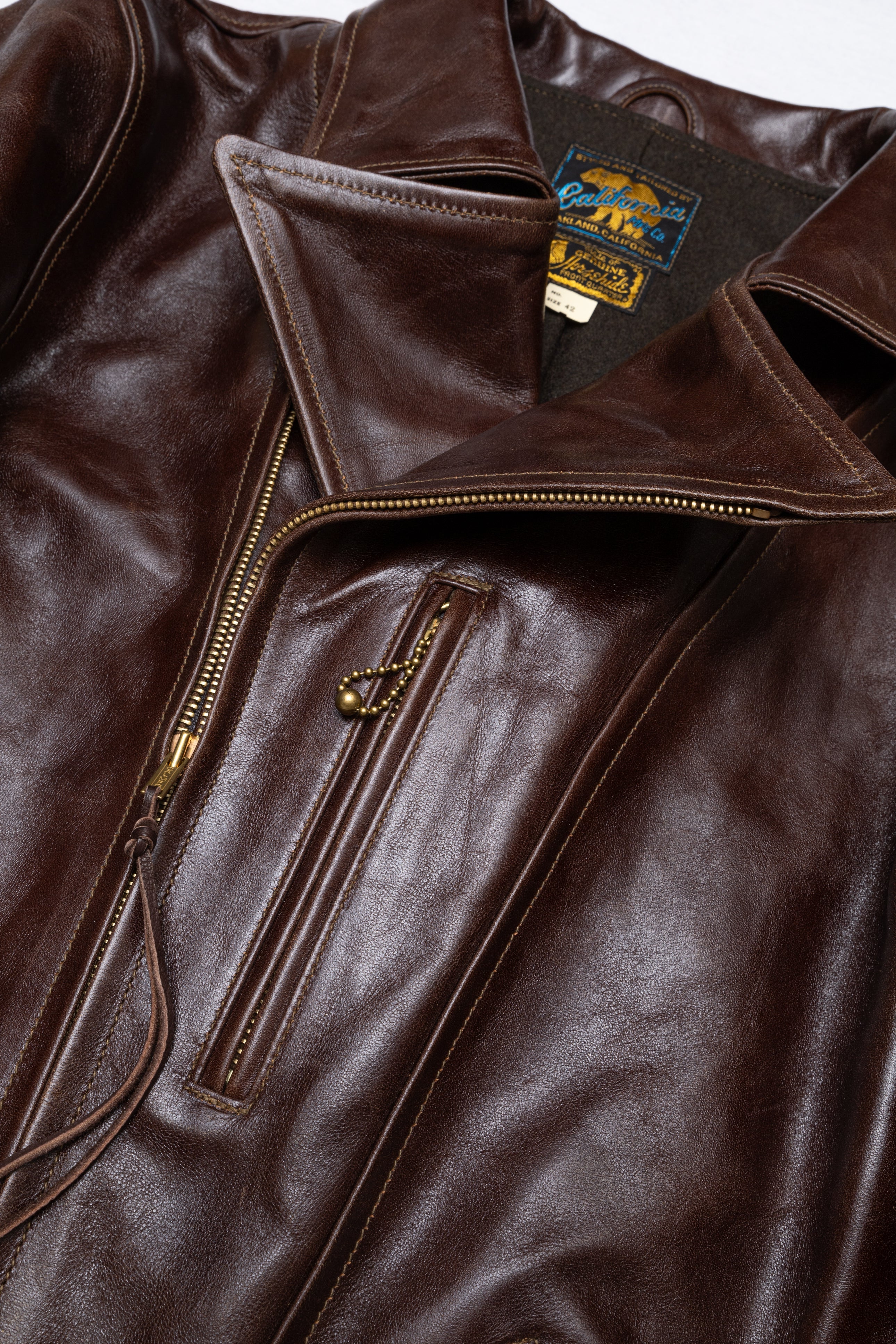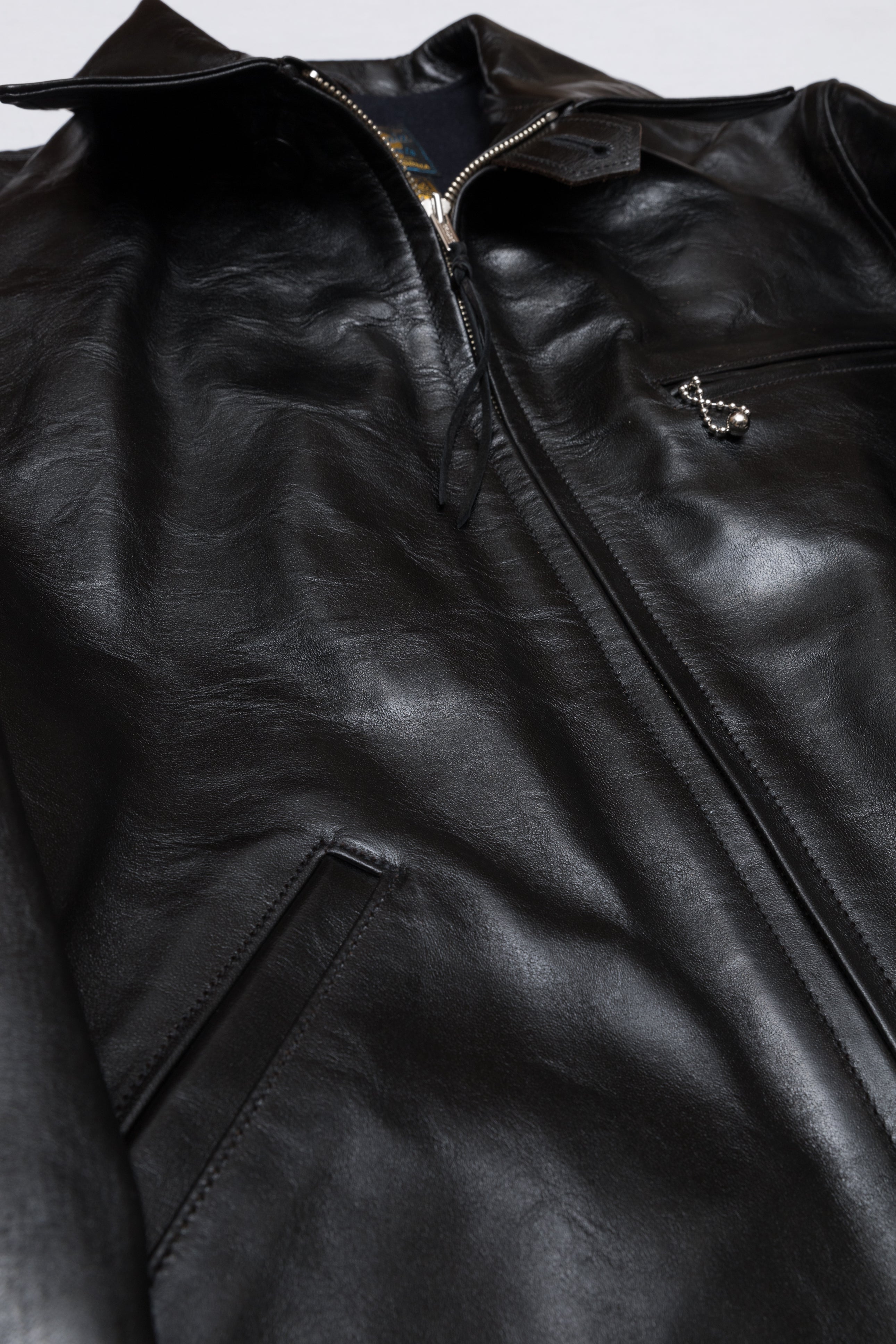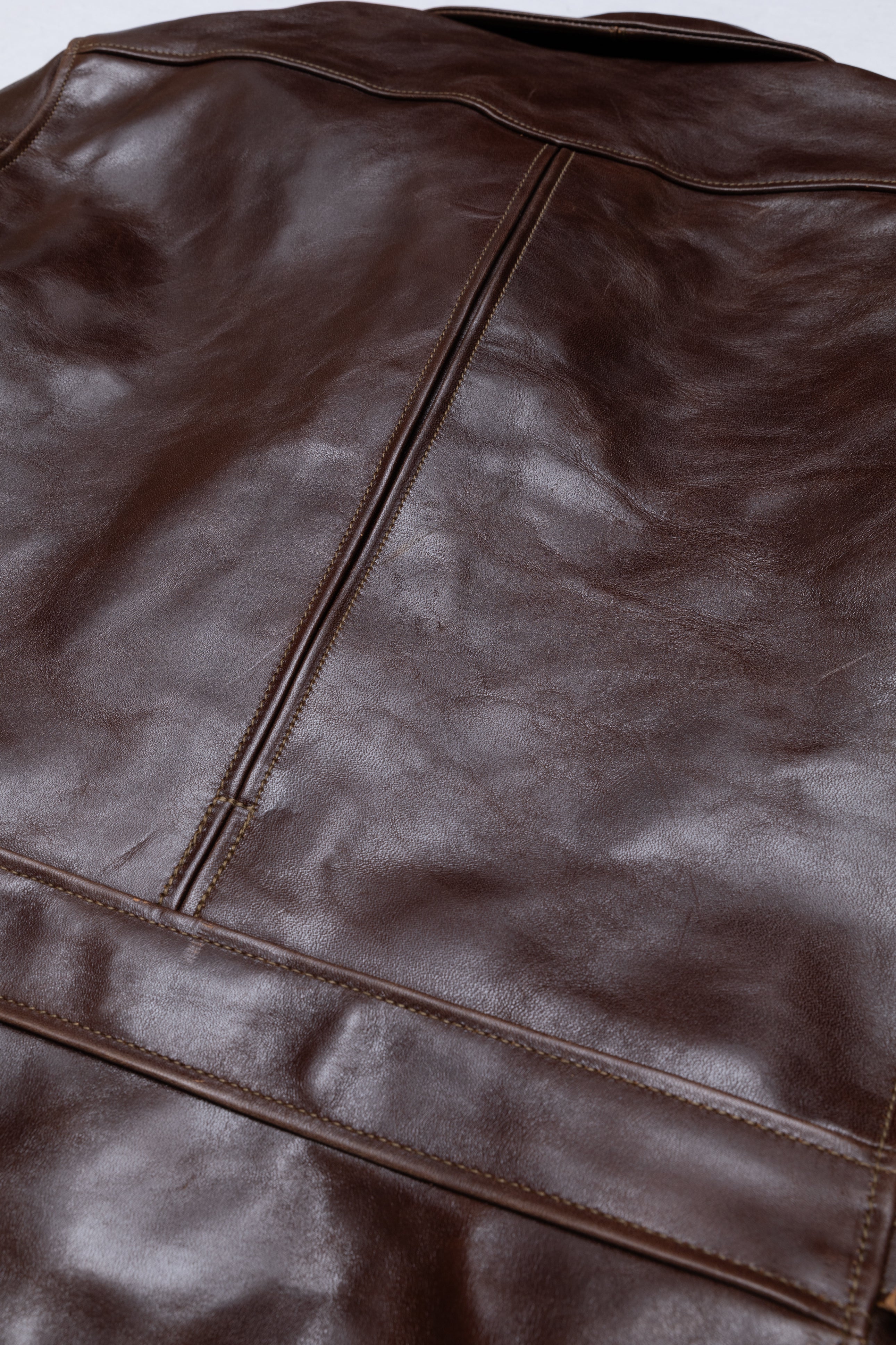 Desde entonces he confeccionado muchos estilos de chaquetas de cuero en nuestra propia fábrica, utilizando sólo cuero japonés, piezas japonesas a medida, hilo de algodón japonés, etc. Solemos estudiar las antiguas chaquetas militares, de moto y deportivas americanas. Tienen detalles muy interesantes y son a la vez desafiantes y divertidas de reproducir. En cuanto al cuero, solemos trabajar con piel de caballo, que tiene mucho potencial para hacer chaquetas de cuero de estilo antiguo.