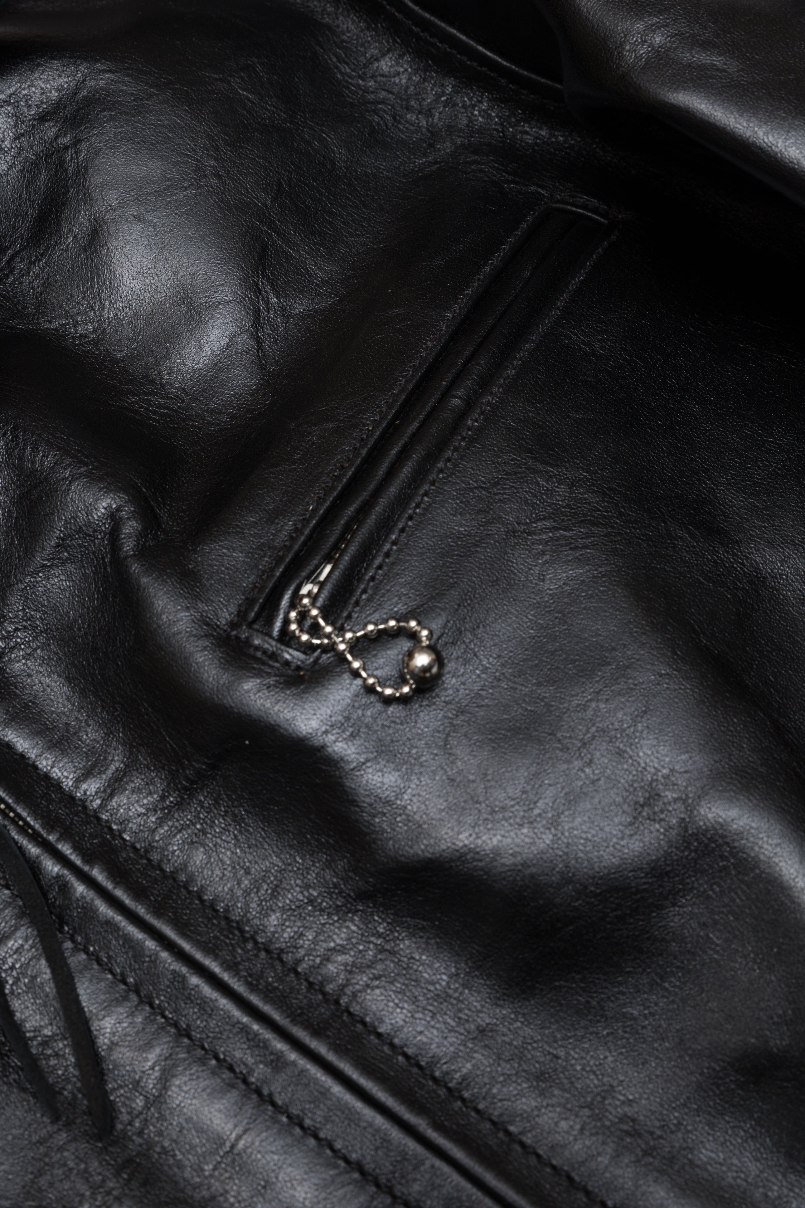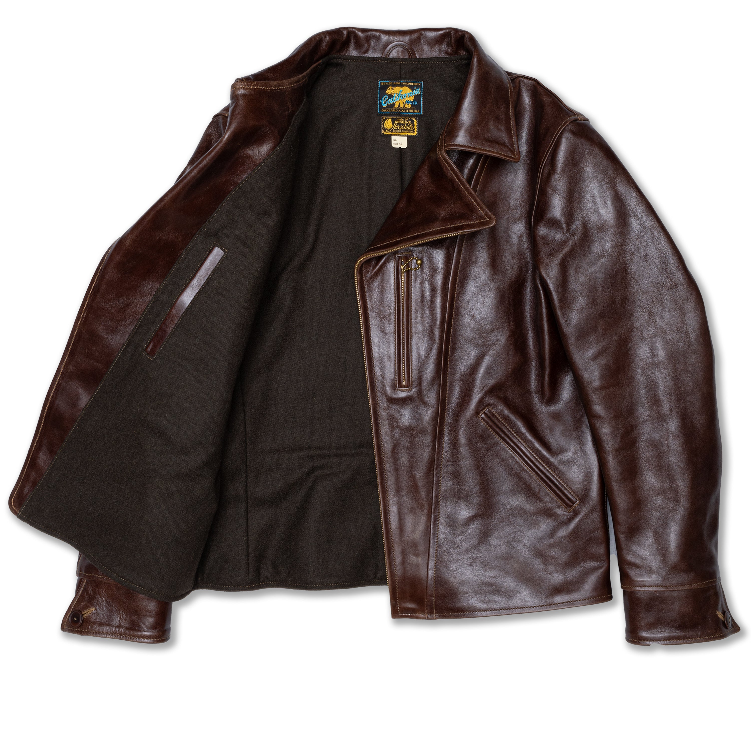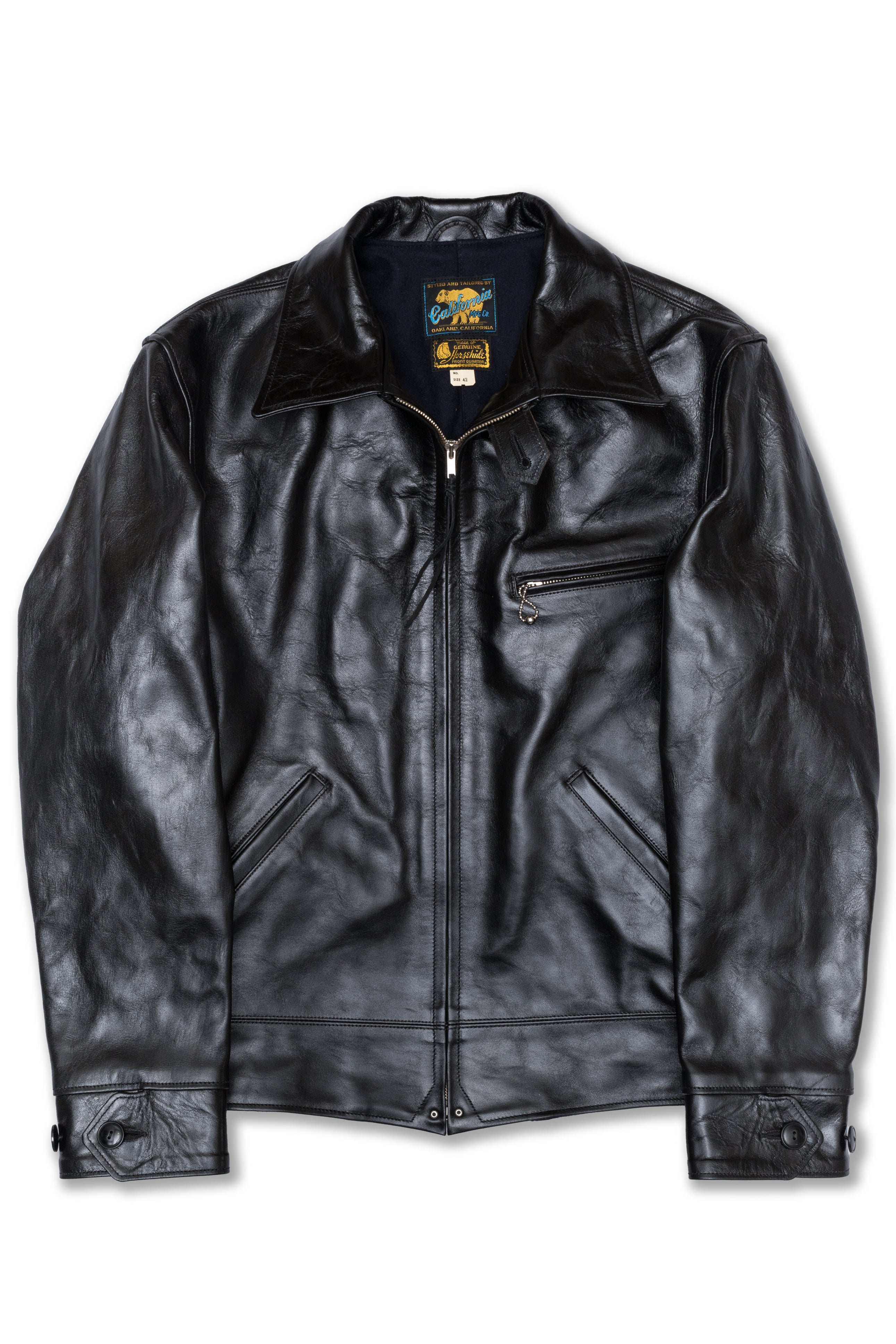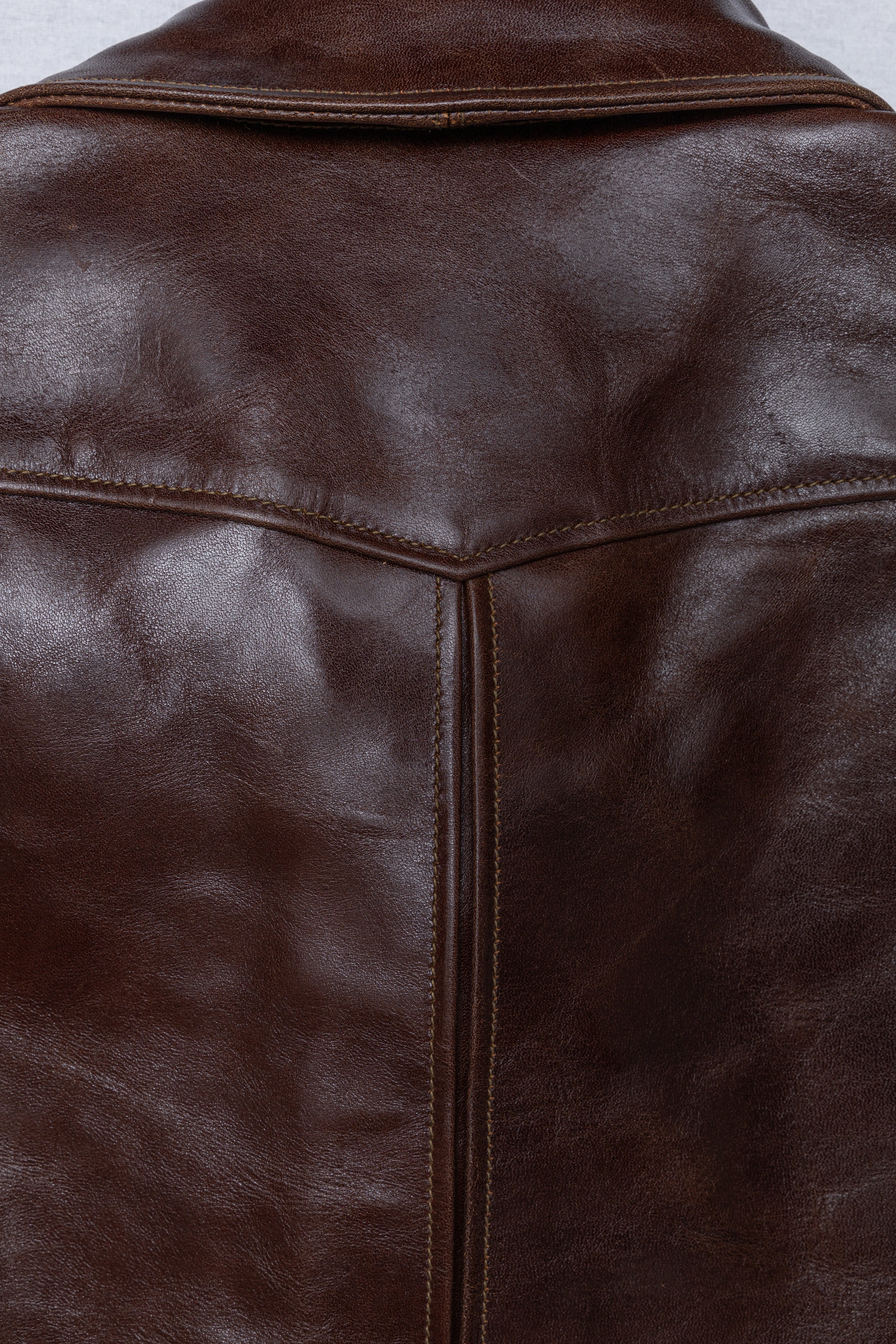 Desde entonces he confeccionado muchos estilos de chaquetas de cuero en nuestra propia fábrica, utilizando sólo cuero japonés, piezas japonesas a medida, hilo de algodón japonés, etc. Solemos estudiar las antiguas chaquetas militares, de moto y deportivas americanas. Tienen detalles muy interesantes y son a la vez desafiantes y divertidas de reproducir. En cuanto al cuero, solemos trabajar con piel de caballo, que tiene mucho potencial para hacer chaquetas de cuero de estilo antiguo.