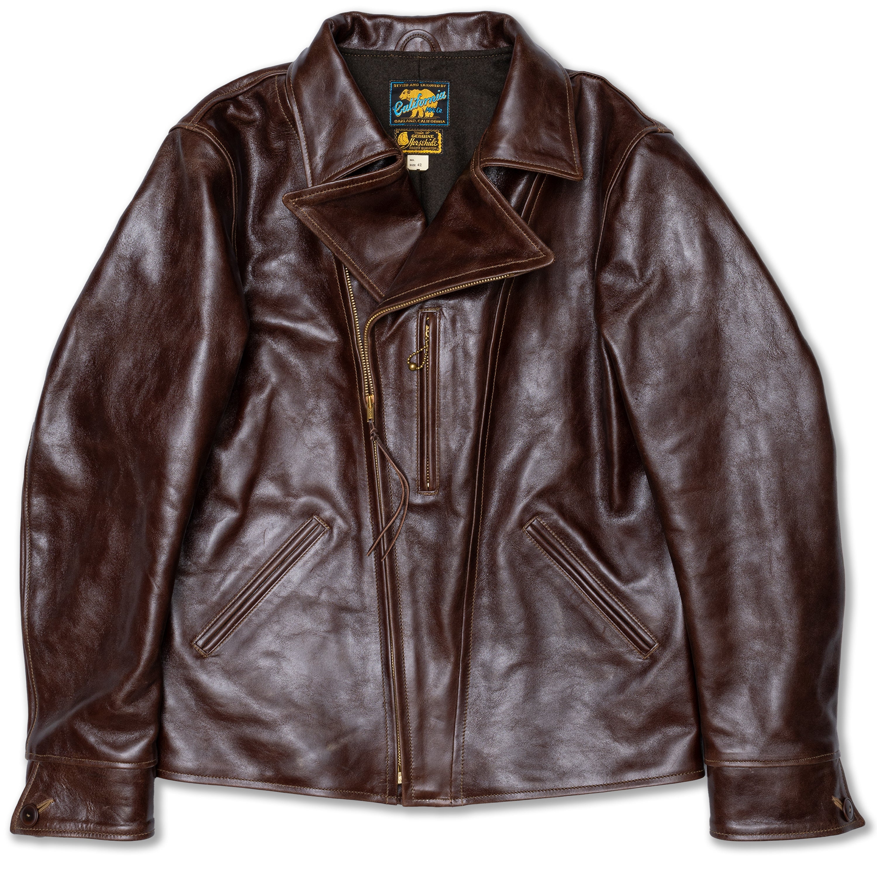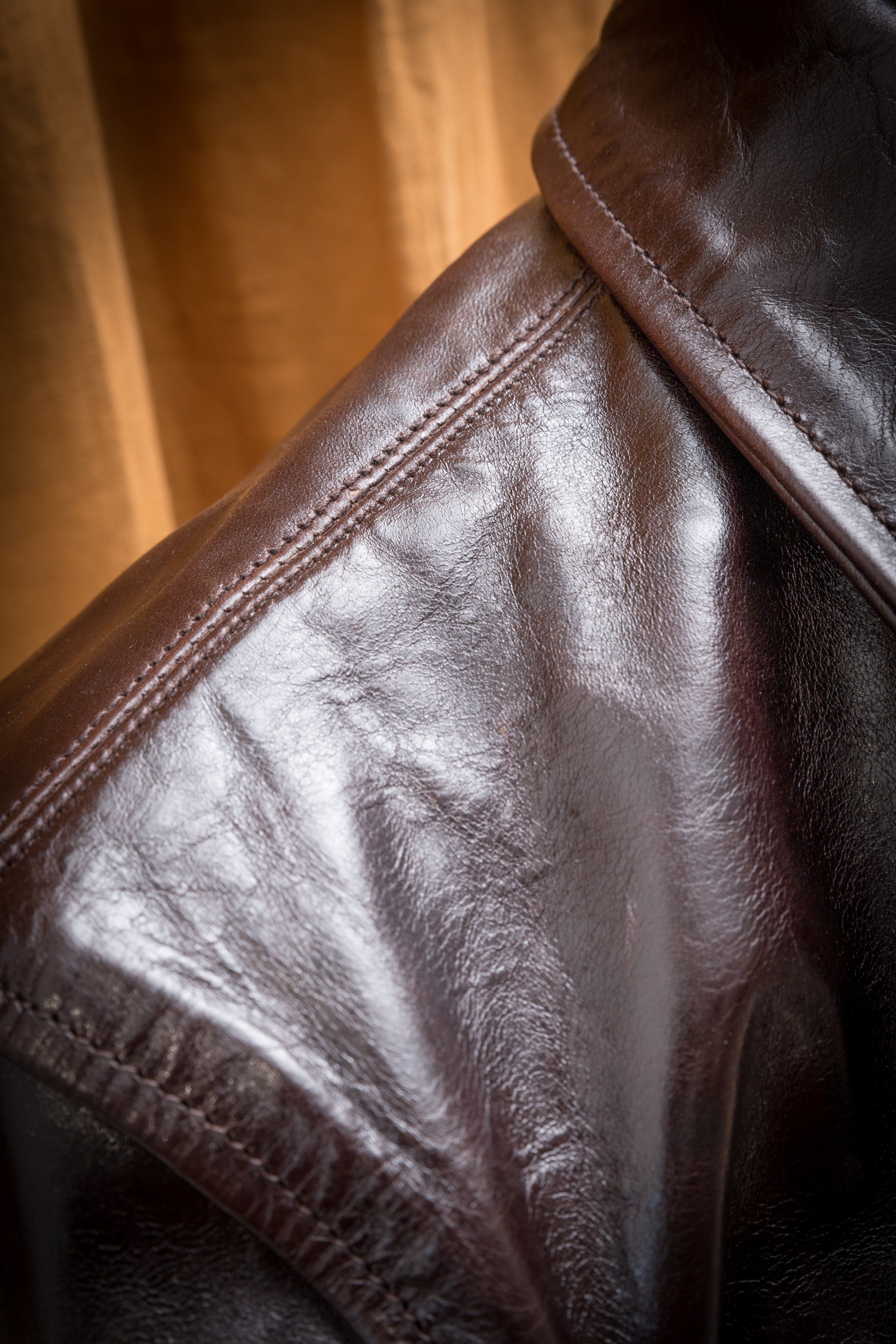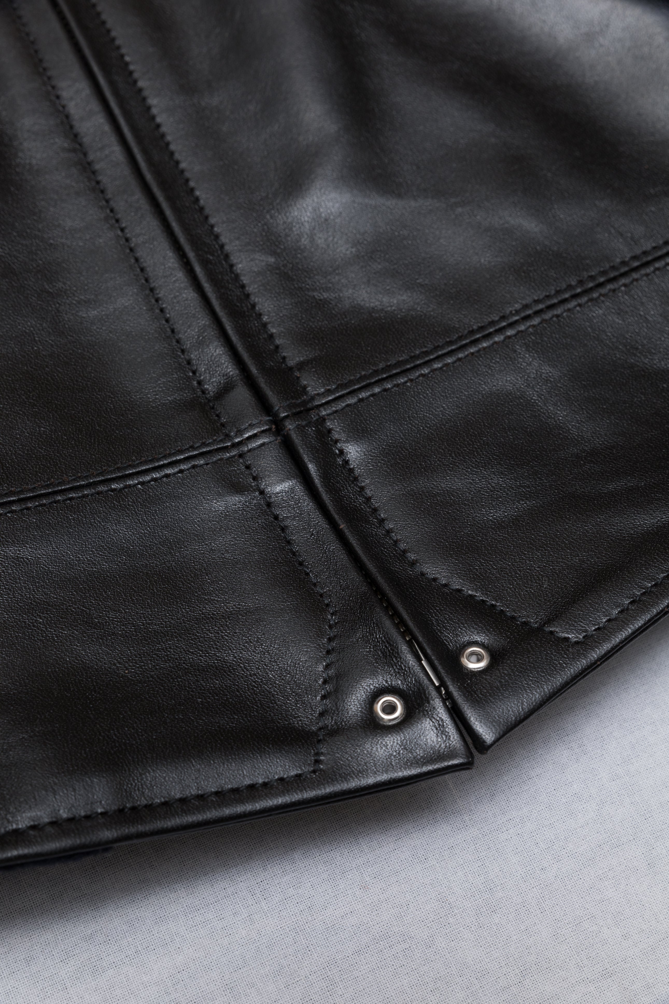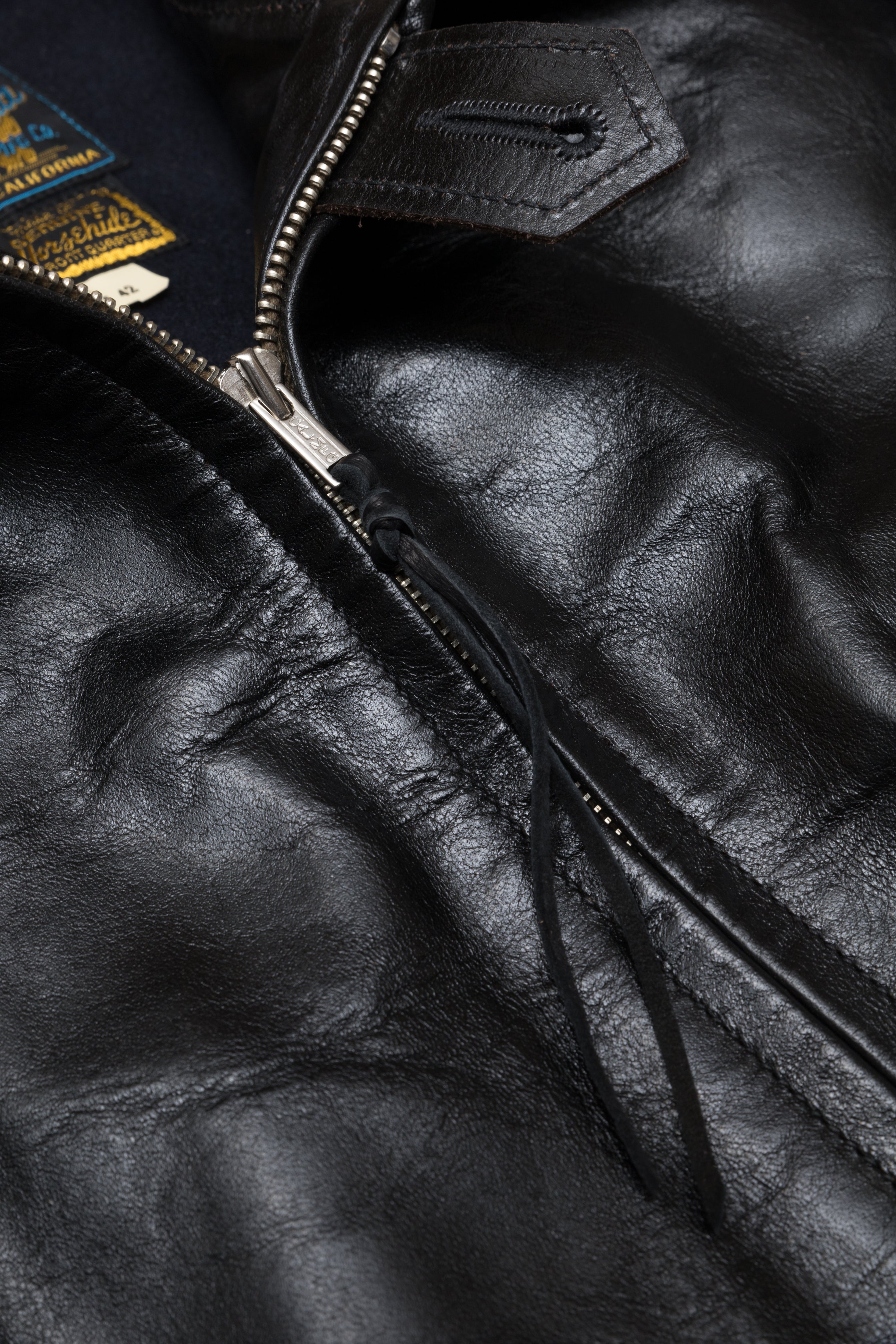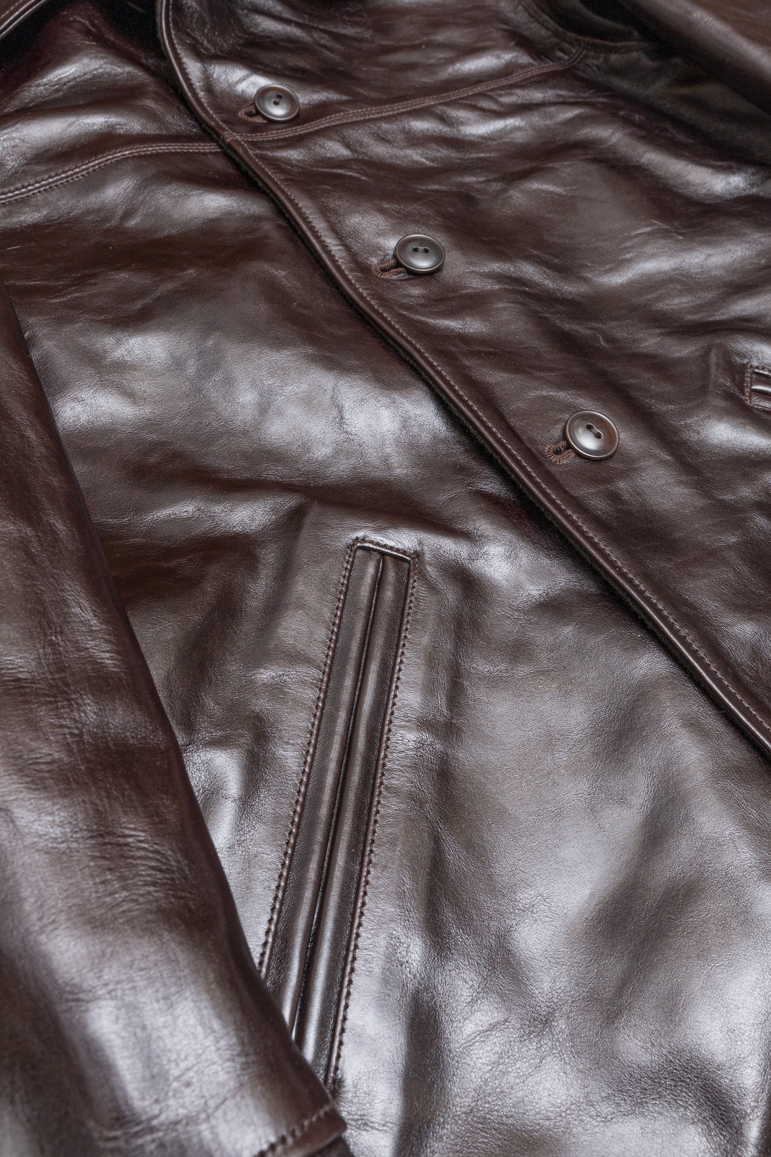 Desde entonces he confeccionado muchos estilos de chaquetas de cuero en nuestra propia fábrica, utilizando sólo cuero japonés, piezas japonesas a medida, hilo de algodón japonés, etc. Solemos estudiar las antiguas chaquetas militares, de moto y deportivas americanas. Tienen detalles muy interesantes y son a la vez desafiantes y divertidas de reproducir. En cuanto al cuero, solemos trabajar con piel de caballo, que tiene mucho potencial para hacer chaquetas de cuero de estilo antiguo.