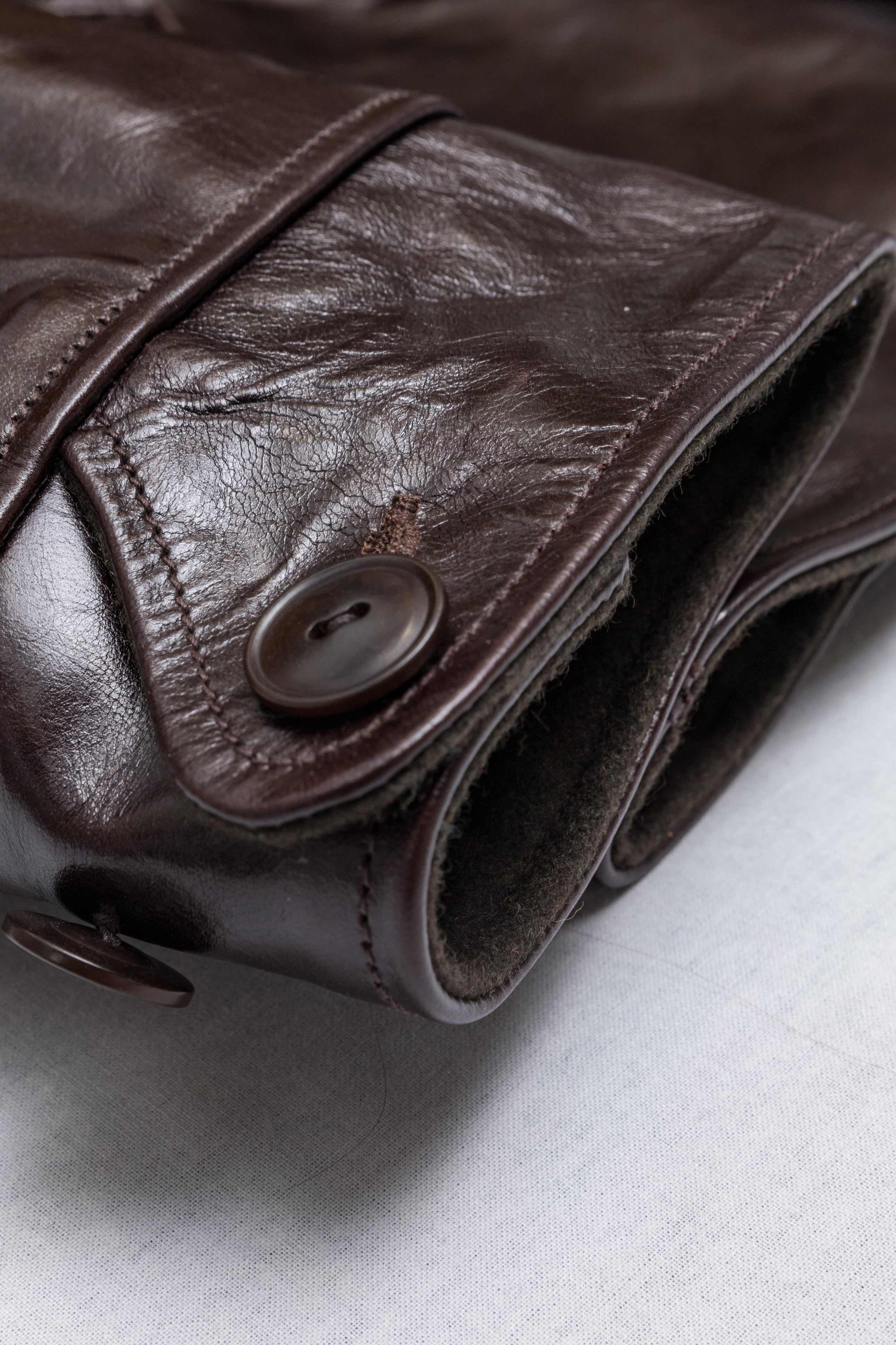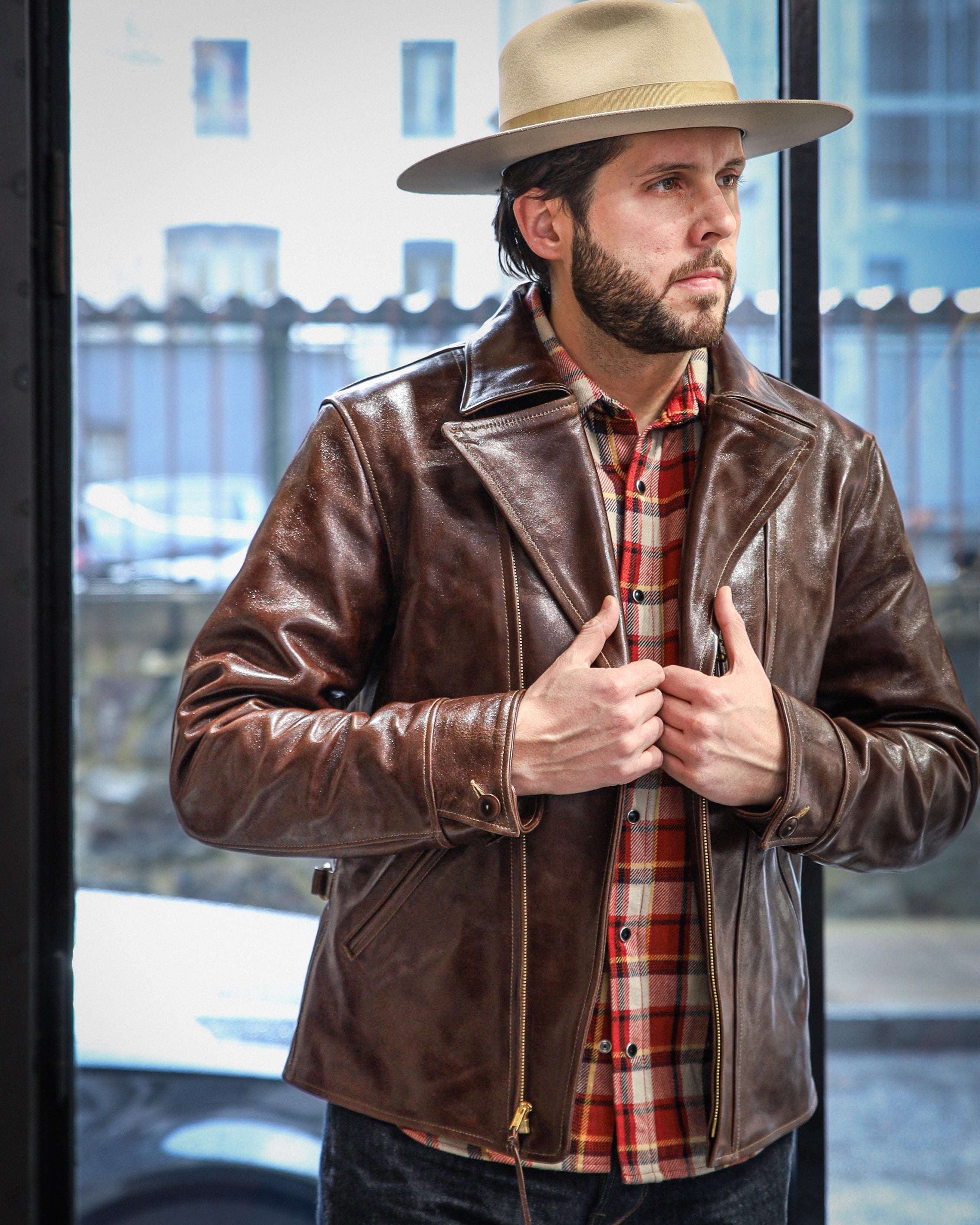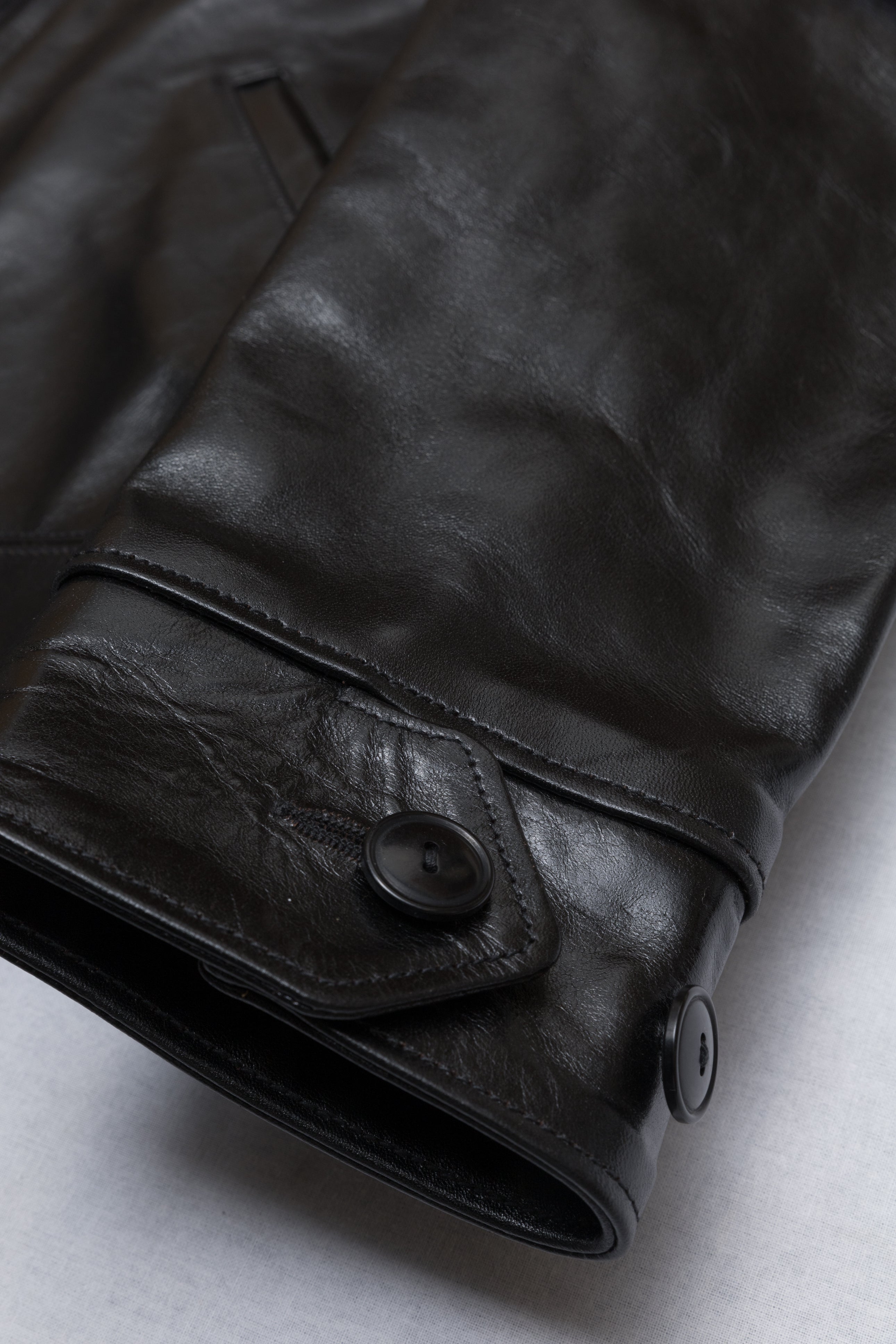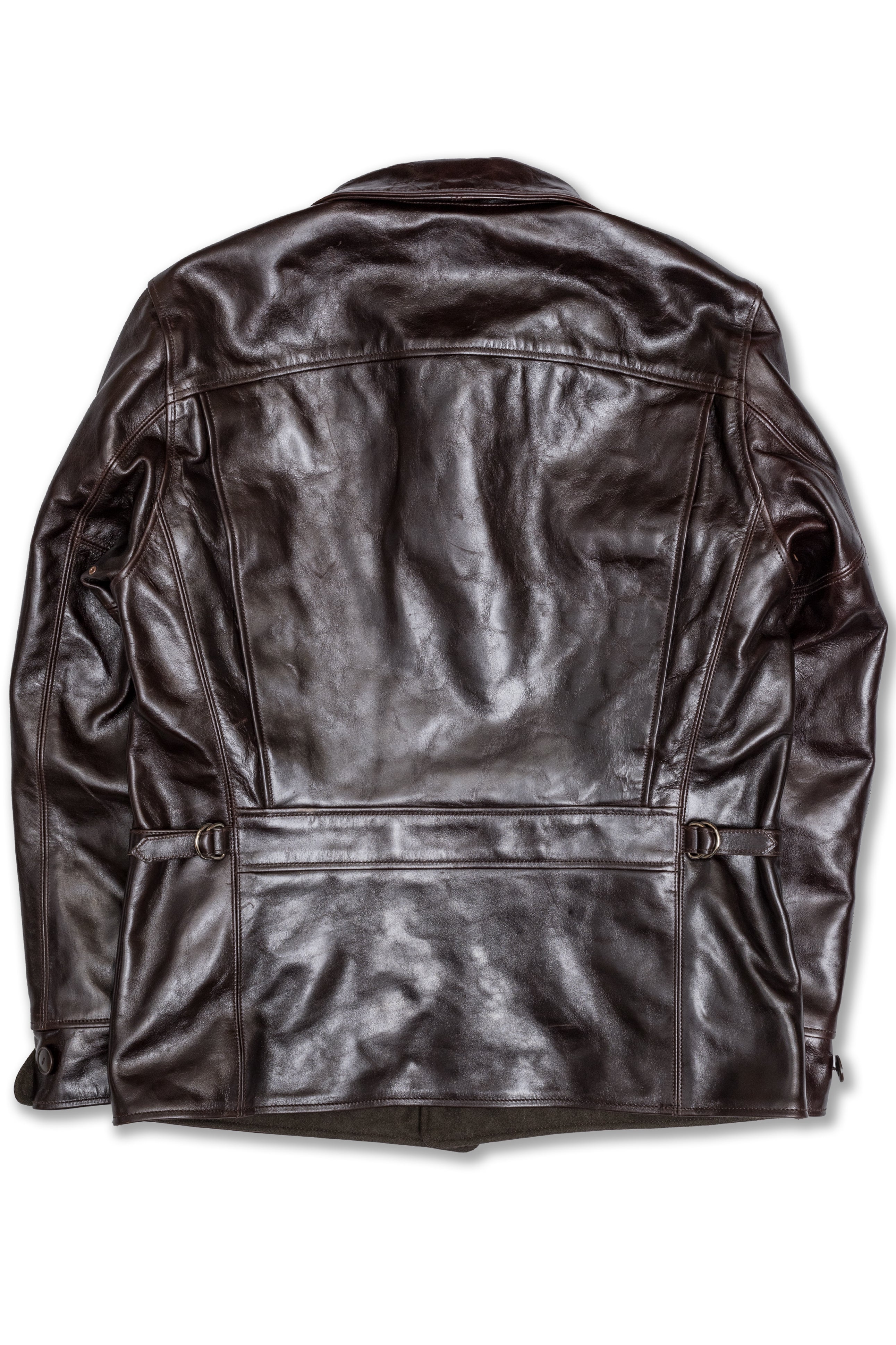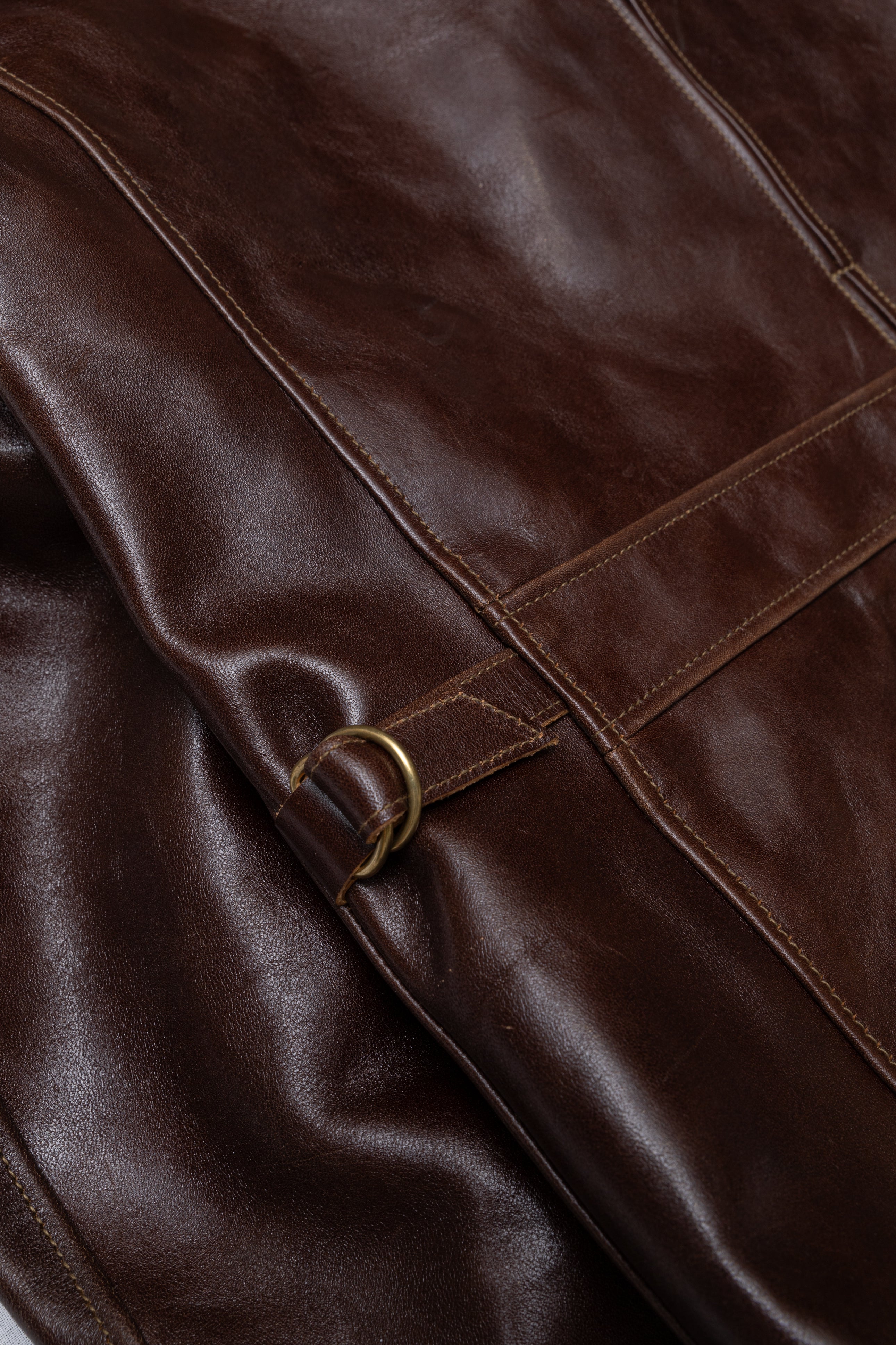 Desde entonces he confeccionado muchos estilos de chaquetas de cuero en nuestra propia fábrica, utilizando sólo cuero japonés, piezas japonesas a medida, hilo de algodón japonés, etc. Solemos estudiar las antiguas chaquetas militares, de moto y deportivas americanas. Tienen detalles muy interesantes y son a la vez desafiantes y divertidas de reproducir. En cuanto al cuero, solemos trabajar con piel de caballo, que tiene mucho potencial para hacer chaquetas de cuero de estilo antiguo.